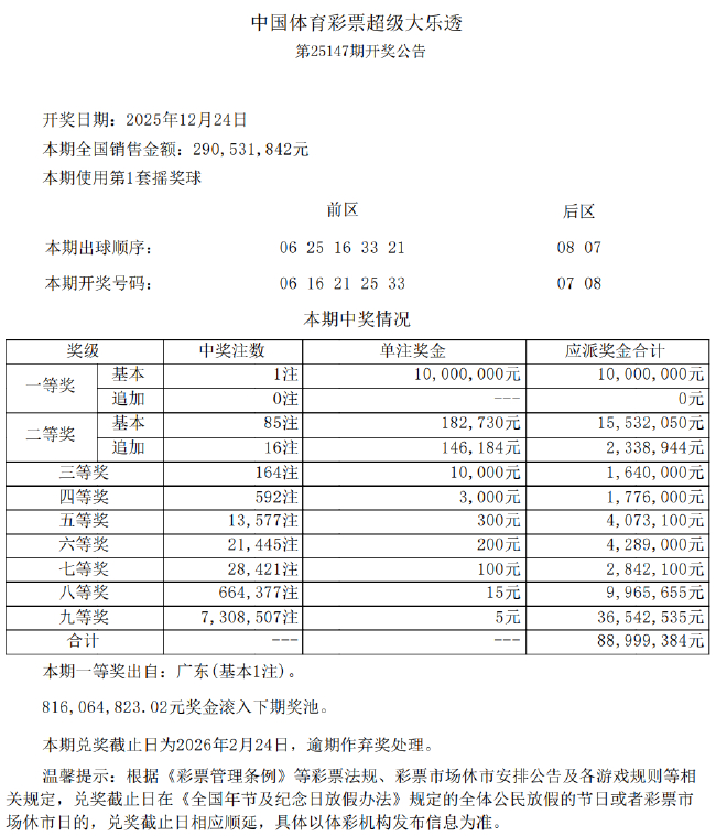 北京时间12月24日晚,体彩大乐透第25147期开奖,当期开奖号码为前区06 16 21 25 33,后区07 08。