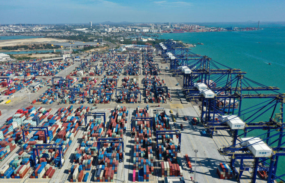 这是2025年11月28日拍摄的海南洋浦港。该港是海南自贸港10个“二线口岸”之一(无人机照片)。新华社记者 郭程 摄