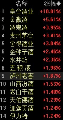 白酒股震荡走高,皇台酒业涨停,金徽酒、酒鬼酒、贵州茅台、舍得酒业、金种子酒跟涨。