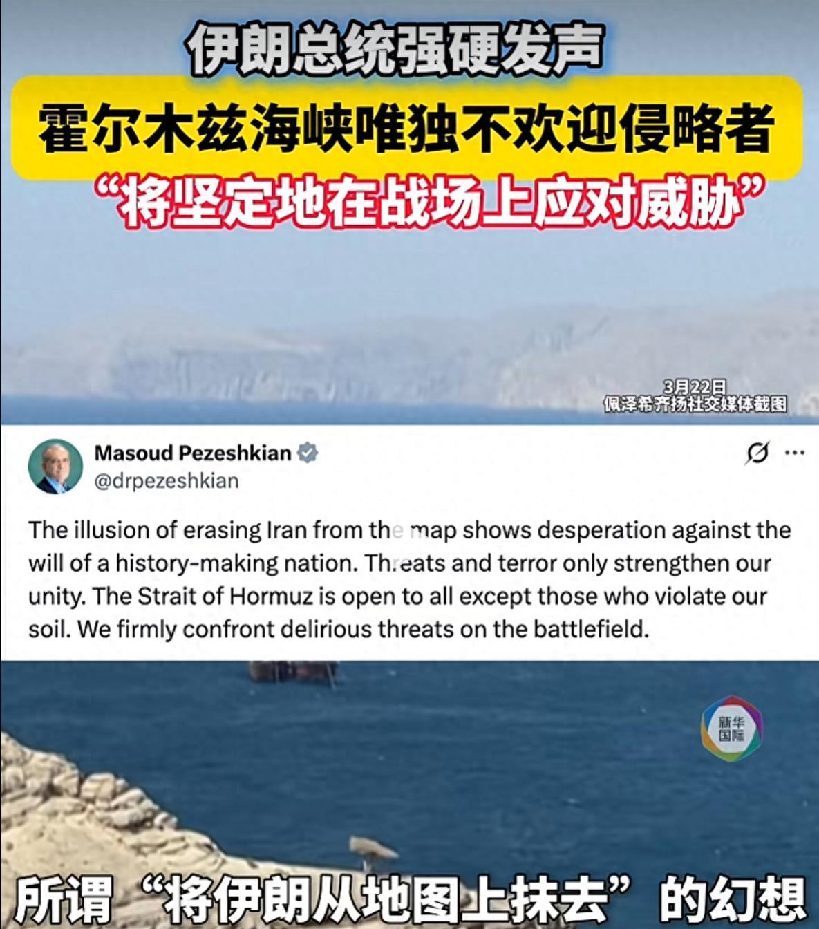 伊朗总统佩泽希齐扬22日在社交媒体发文说,霍尔木兹海峡对所有人开放,唯独不欢迎那些侵犯伊朗领土的侵略者。佩泽希齐扬表示,所谓“将伊朗从地图上抹去”的幻想,不过是面对一个创造历史的民族的意志时所流露的绝望。“威胁和恐怖只会进一步巩固我们的团结……我们将坚定地在战场上应对这些疯狂的威胁。”美国总统特朗普21日向伊朗发出威胁,要求伊朗在48小时内开放霍尔木兹海峡,否则将摧毁其各类发电厂。特朗普在社交媒体上说:“如果伊朗未能从此刻起的48小时内,不加威胁地完全开放霍尔木兹海峡,美国将打击并摧毁伊朗的各类发电厂,首先是最大的那座!”来源:新华社