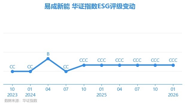 日前,华证指数公布了新一期(2026年1月31日)的ESG评级结果,易成新能(300080.SZ)获得CCC评级(华证指数评级为C起至AAA九档,C为最低档,AAA为其最高一级评级/AA为其第二档),上一期(2025年10月31日)ESG评级为CCC。本期ESG评级在20家独立电力生产商与能源贸易商行业A股上市公司中排名第15(上一期排名第15)。